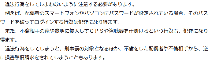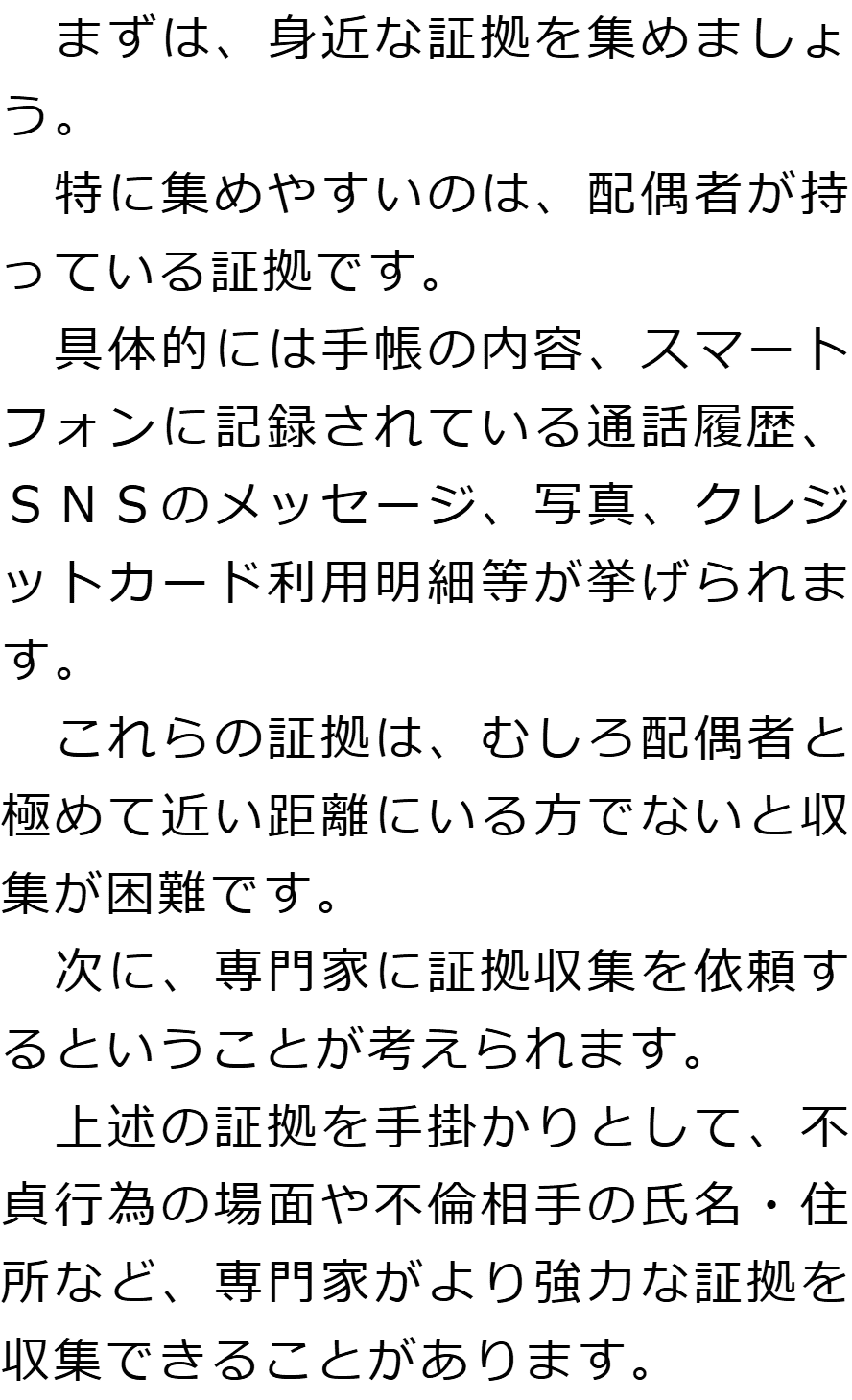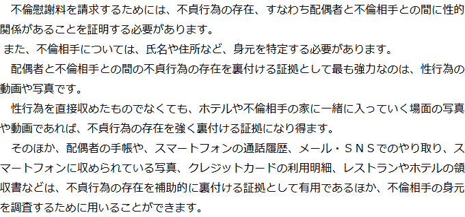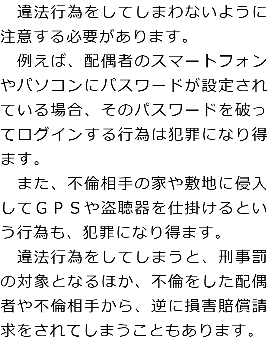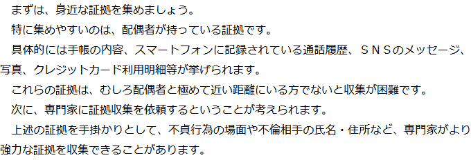 トップお役立ち情報・Q&AQ&A不倫慰謝料の証拠に関するQ&A 階層構造▼ お役立ち情報・Q&A(目次) 不倫慰謝料の証拠に関するQ&AQどのようなものが証拠になりますか?Qどのように証拠を集めればいいですか?Q不倫慰謝料の証拠を集める際に注意すべきことはありますか?Q不倫慰謝料の証拠として認められないものはありますか? Qどのようなものが証拠になりますか?AQどのように証拠を集めればいいですか?AQ不倫慰謝料の証拠を集める際に注意すべきことはありますか?AQ不倫慰謝料の証拠として認められないものはありますか?A お役立ち情報・Q&A(目次)お役立ち情報・Q&Aトップお役立ち情報配偶者に不倫慰謝料を請求する場合の流れQ&A不倫慰謝料の証拠に関するQ&A 受付時間 平日 9時~21時、土日祝 9時~18時夜間・土日祝の相談も対応します(要予約) 所在地 〒060-0808 北海道札幌市北区北八条西4‐1-1パストラルビルN8 2F (札幌弁護士会) 0120-41-2403 お問合せ・アクセス・地図
