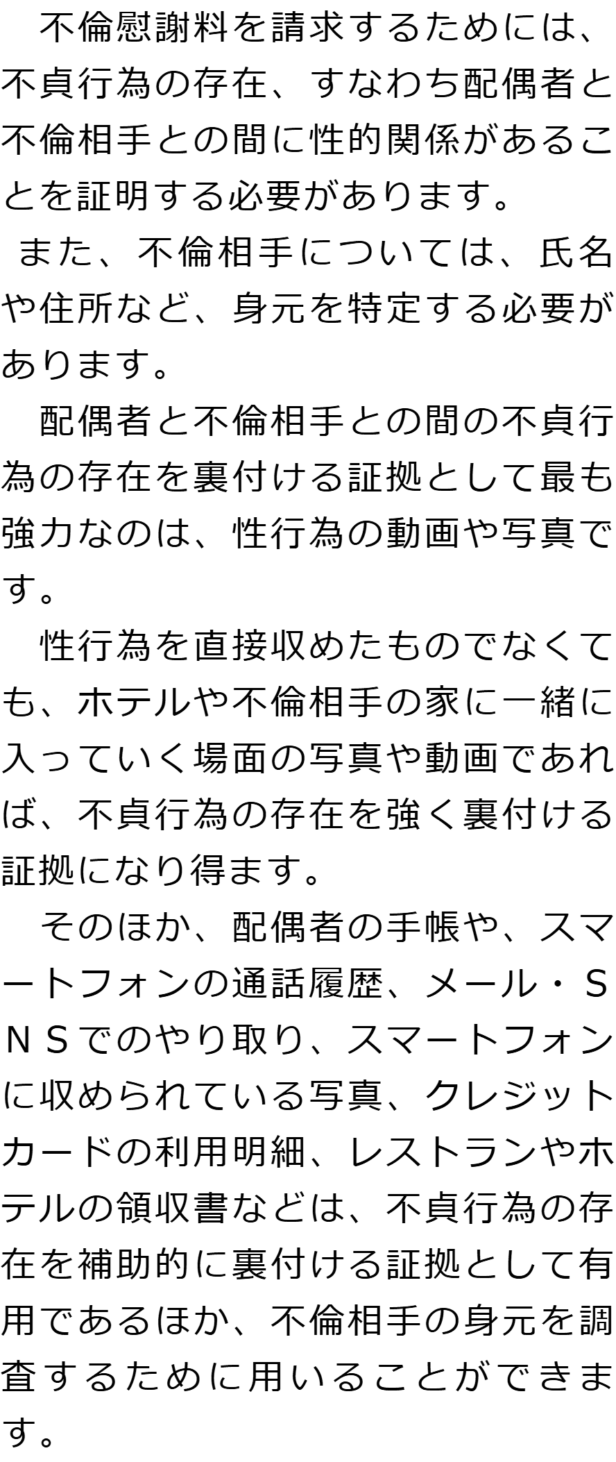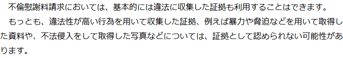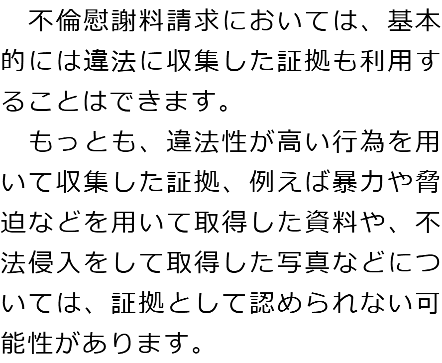 不倫慰謝料の証拠に関するQ&AQどのようなものが証拠になりますか?Qどのように証拠を集めればいいですか?Q不倫慰謝料の証拠を集める際に注意すべきことはありますか?Q不倫慰謝料の証拠として認められないものはありますか? Qどのようなものが証拠になりますか?AQどのように証拠を集めればいいですか?AQ不倫慰謝料の証拠を集める際に注意すべきことはありますか?AQ不倫慰謝料の証拠として認められないものはありますか?A お役立ち情報・Q&A(目次)お役立ち情報・Q&Aトップお役立ち情報配偶者に不倫慰謝料を請求する場合の流れQ&A不倫慰謝料の証拠に関するQ&A 受付時間 平日 9時~21時、土日祝 9時~18時夜間・土日祝の相談も対応します(要予約) 所在地 〒060-0808 北海道札幌市北区北八条西4‐1-1パストラルビルN8 2F (札幌弁護士会) 0120-41-2403 お問合せ・アクセス・地図
